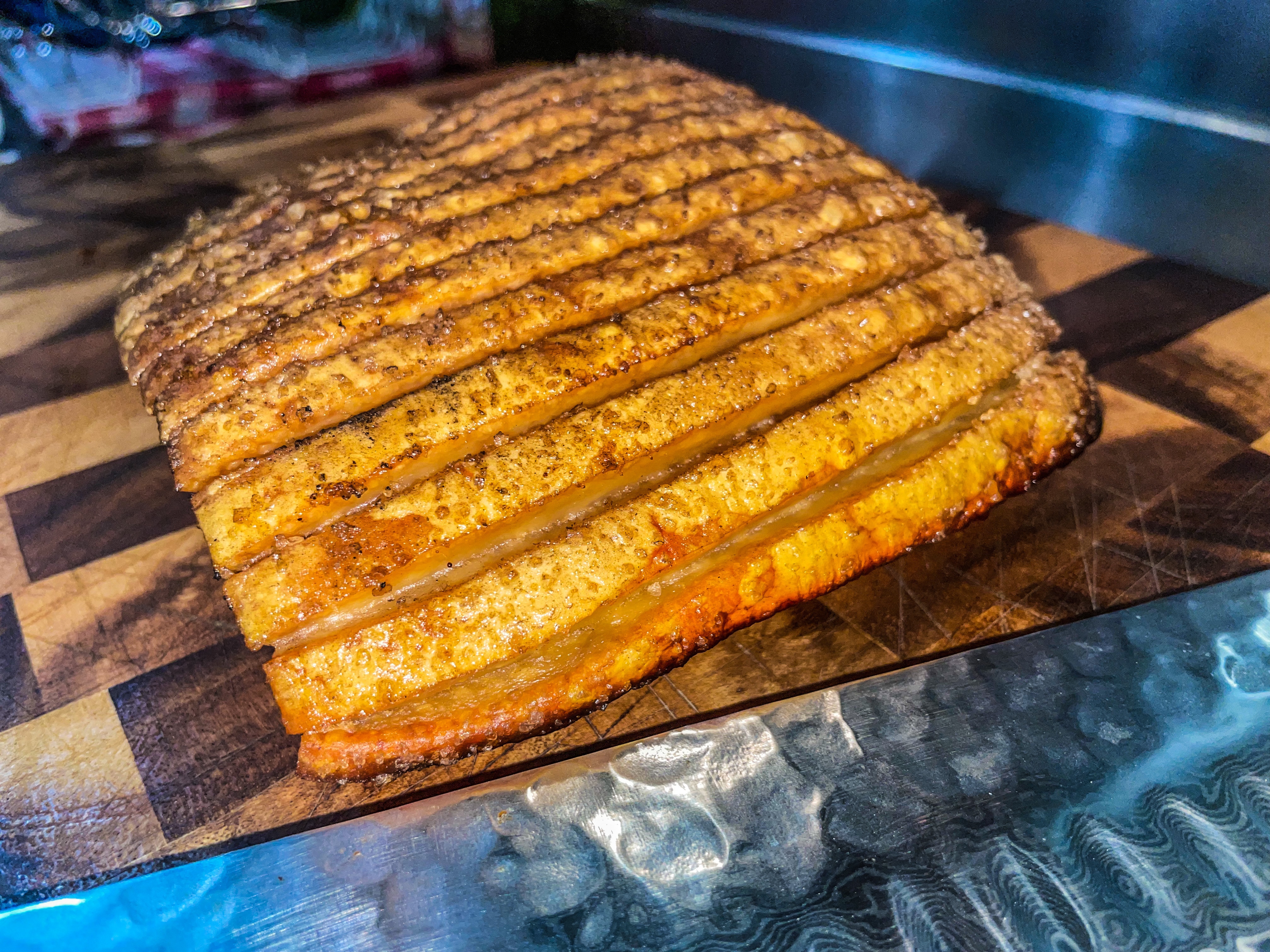 17. Using my brisket knife I sliced through each pork belly where I had pre-sliced the skin, with no resistance, and watched as the juices flowed onto the board as I sliced away.