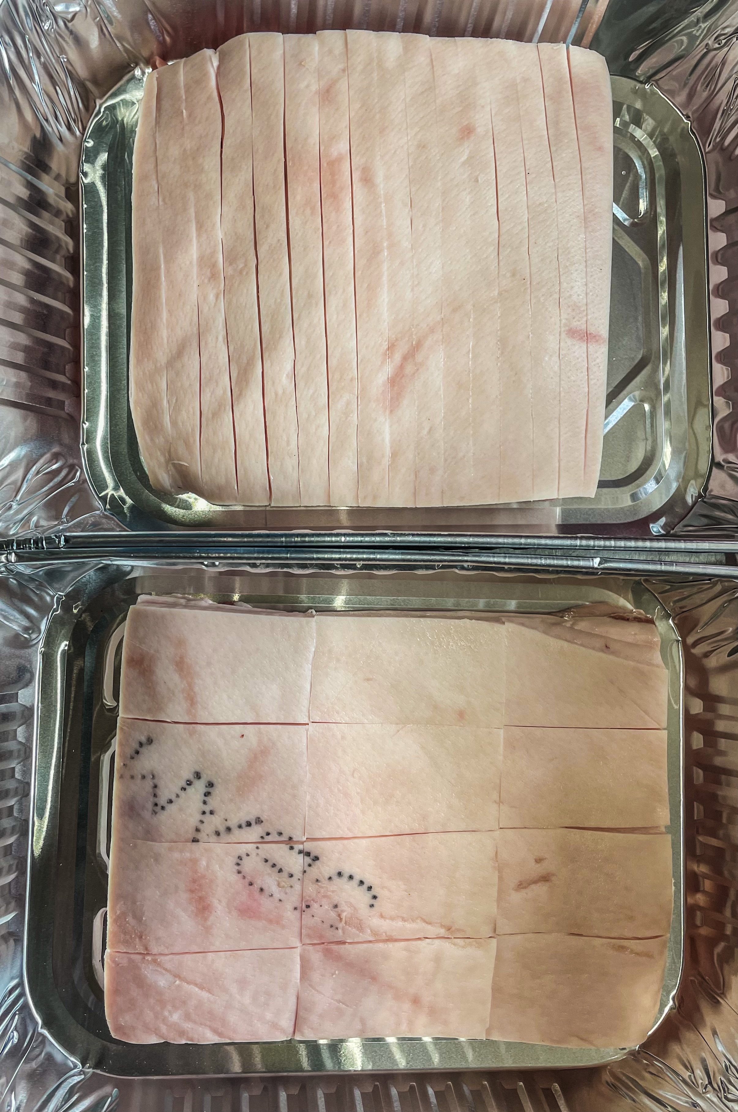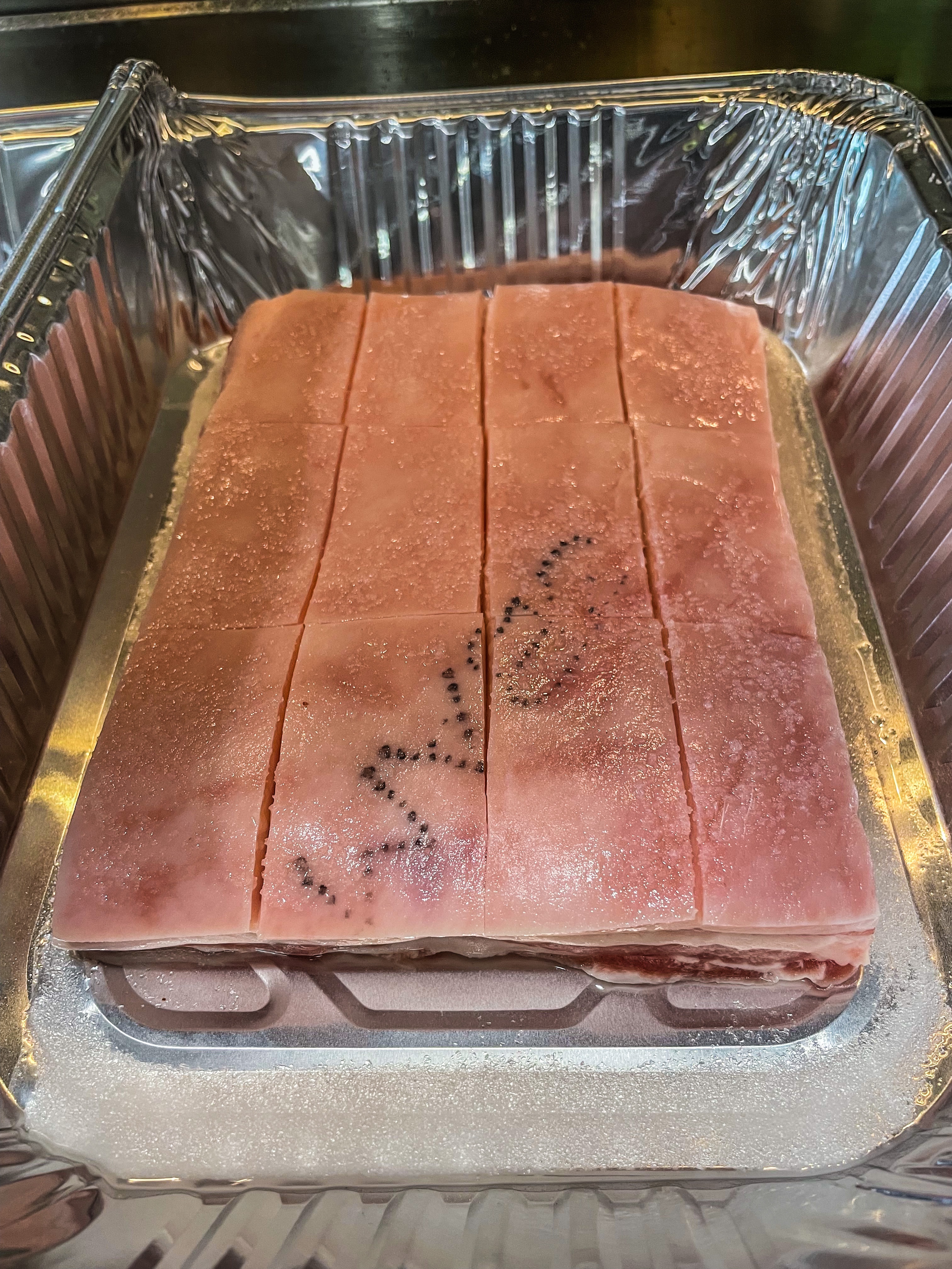 5. Using a sharp knife cut through the skin into how you would like your portions served. I did one belly with 6-8mm parallel lines for slices and the other into rectangles for thick pieces of belly to enjoy.